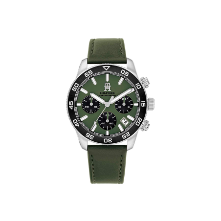 Reloj Tommy Hilfiger Hombre Chrono Esfera Verde 1792188: Reloj Tommy Hilfiger para hombre fabricado en acero inoxidable y bisel en color verde y correa de piel del mismo color. Dispone de esfera en color verde, tres agujas en blanco y plateado, tres subesferas y marcadores en forma barra. Un diseño elegante perfecto para combinar con tus looks diarios y formales.