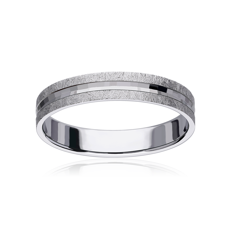 ALIANZA "NEXO" ORO BLANCO 18K 3100026: Fabricada en oro blanco de primera ley, con canal central facetado y pulido y bordes satinados efecto hielo. Superficie e interior planos.