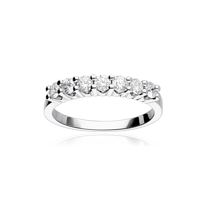 ANILLO "VERNAZZA" ORO BLANCO 18K Y DIAMANTES 0.50 CTS: Fabricado en oro blanco de primera ley, con 7 diamantes naturales, de excepcional color Blanco Wesselton H y pureza VS1, engastados en garra de 4 patillas sobre cuerpo de sección rectangular con un peso total de 0.50 cts.