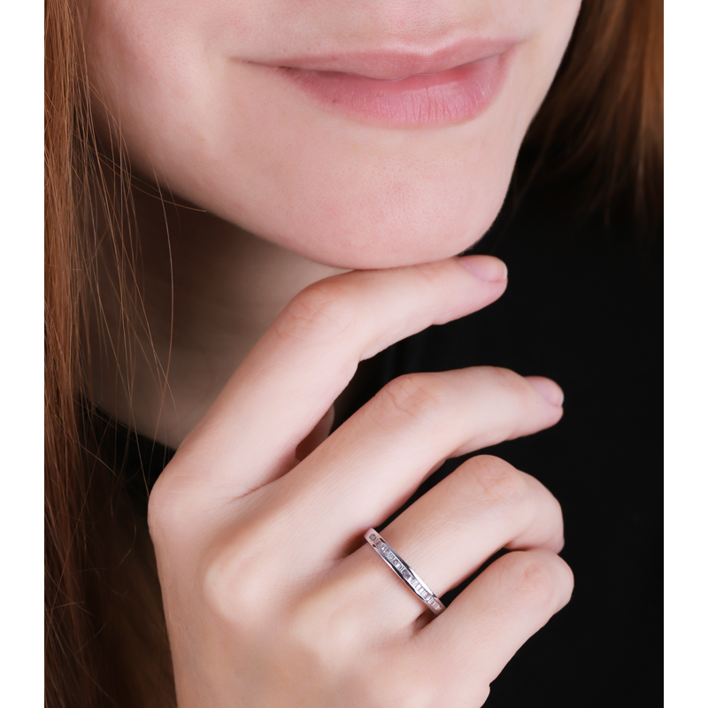 Anillo "Beyond" diamantes 0.15 cts: Fabricado en oro blanco de primera ley, con diamantes talla baguette, sumando un peso total de 0.15 cts y engastados en carril, de color Blanco Wesselton H y pureza Vs1. Acabado pulido.