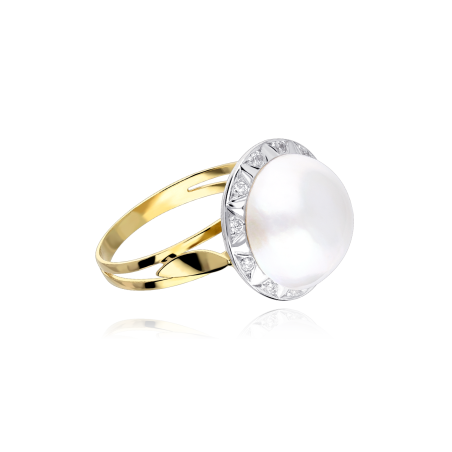 Anillo Oro 18k perla y circonitas "Mabe": Esta imponente joya clásica y atemporal esta compuesta por una elegante perla cultivada, también denominada "Mabe" o "Japonesa" en la parte frontal y contorno en oro blanco con circonitas talla brillante. Acabado pulido.