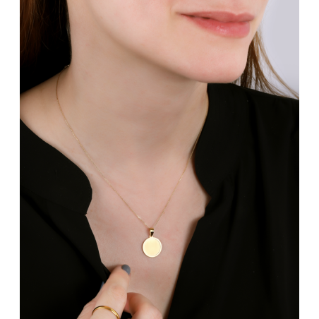 Medalla Oro 18k 14mm "Borgia": Medalla lisa, para grabar por ambas caras, la parte frontal es satinada con bisel pulido. La parte trasera es de acabado brillo.