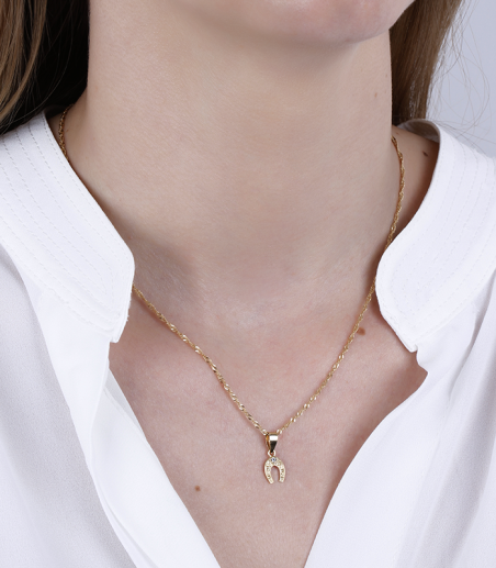 Colgante herradura de oro amarillo de 18 quilates con circonita blanca. Posee un cuidado acabado tallado y pulido que junto a la piedra, hacen de esta joya una delicada y bonita pieza. Medidas sin asa: 12 x 7 milímetros. Medidas con asa: 19 x 7 milímetros.