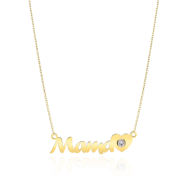 GARGANTILLA "SIMI VALLEY" MAMA ORO 18K: Fabricada en oro amarillo de primera ley, con el texto "mamá" acabado con un bonito corazón en su parte final, el cual lleva engastada una circonita. La cadena de eslabón de estilo forzado es maciza. Cierre de reasa marinera para mayor seguridad.