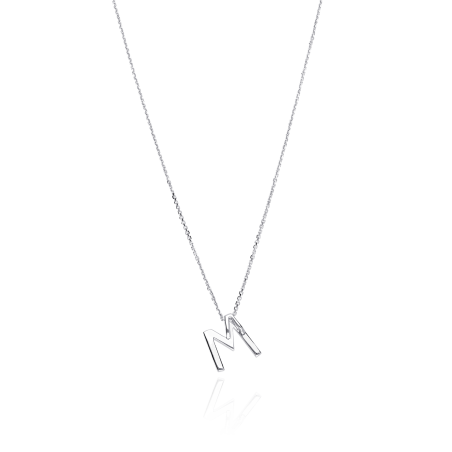 Gargantilla M Oro 18k y diamantes 0.14cts "Duquesa": Cadena con eslabones rectangulares y colgante en forma de letra "M" en Oro 18k blanco en acabado pulido, adornado con 23 diamantes de talla brillante transparentes de 0.14cts de color Blanco Wesselton H y pureza Vs1. Longitud de 45.5 ajustable a 42cm.