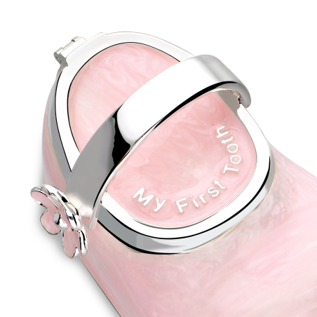 Caja guarda dientes con forma de zapatito infantil. Fabricada en plata de primera ley con esmalte brillante en color rosa. Tapa abatible adornada con una flor y la frase "My first Tooth".Interior forrado en terciopelo beige. Regalo ideal para guardar los primeros dientes de tu bebé o usarlo como pequeño joyero.