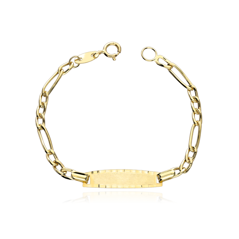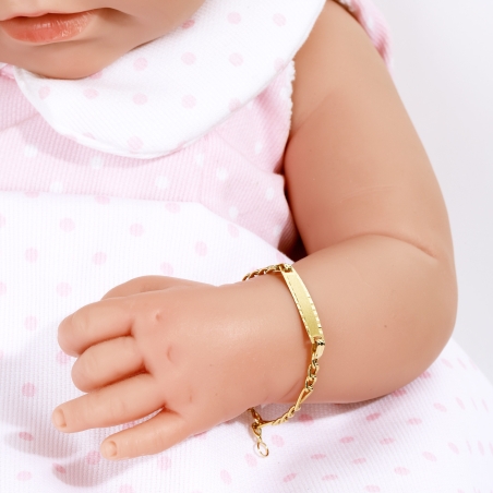 Esclava Oro 18k infantil "Bale": Pulsera de tipo esclava infantil, fabricada en oro de 18k amarillo en acabado pulido. Placa central con bordes tallado y centro satinado. Eslabones estilo 3x1 y cierre de tipo reasa. Opción de grabación tanto delantera como trasera. Pieza ideal como primera puesta infantil.