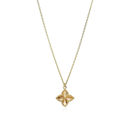 Gargantilla Oro 18k "Clover": Elegante gargantilla fabricada en oro amarillo de 18 quilates con acabado pulido. Como colgante lleva una flor de 4 pétalos con cuidada textura facetada. Cadena de eslabones redondeados y cierre de tipo reasa con longitud regulable.