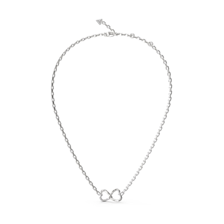 Collar Guess Acero Mon Amour JUBN04616JWRHT-U: Gargantilla fabricada en acero inoxidable pulido, con adorno central en forma de dos corazones entrelazados decorados con circonitas de talla brillante transparentes y logotipo. Eslabones de tipo rectangular con anillas para ajustar su longitud y cierre tipo mosquetón.