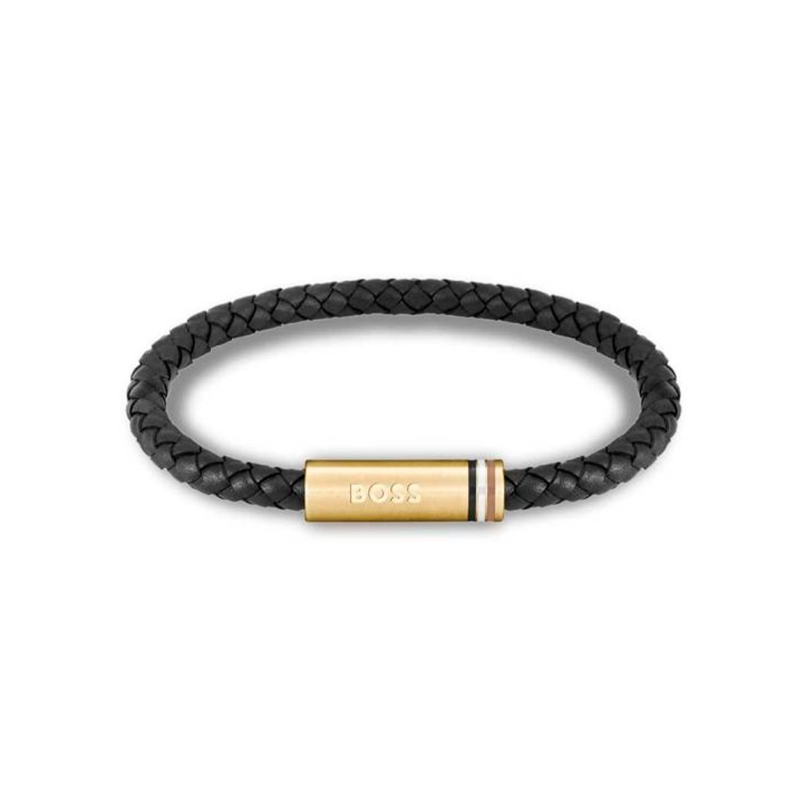 Pulsera Hugo Boss Piel Trenzada Negra 1580624: Pulsera Hugo Boss diseñada para hombre de piel trenzada en color negro y cierre magnético de acero inoxidable con baño de oro en la parte central.
