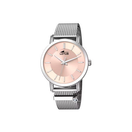Reloj Lotus Mujer Trendy Acero Esfera Rosa 18737/2: Reloj Lotus de mujer fabricado en acero inoxidable con correa en malla milanesa decorada con un cristal brillante. Dispone de esfera en color rosa con marcadores en forma de barra en plateado y tres agujas del mismo color. Un diseño elegante y sofisticado perfecto para combinar con looks casual o formales.