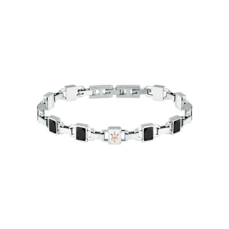 Pulsera Maserati Hombre Acero JM424ATZ41: Pulsera Maserati para hombre fabricada en acero inoxidable en plateado con elementos cerámicos en negro y cristales azules, y el escudo de la marca en rosé.