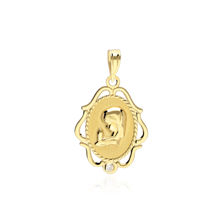 MEDALLA "VIRGEN NIÑA" ORO 18K Y CIRCONITA: Medalla Virgen Niña de Oro 18k con forma ovalada, virgen niña en acabado brillo de alto relieve, sobre fondo satinado que la hace destacar aún mas si cabe. Alrededor de la imagen lambrequines en acabado brillo.
