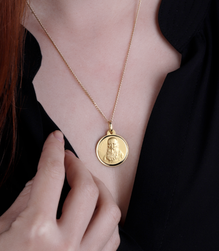 MEDALLA FRAY LEOPOLDO 22 MM ORO 18K: Fabricada en oro amarillo de primera ley, con la imagen de Fray Leopoldo en relieve junto al texto "FRAY LEOPOLDO" , acabado satinado y borde biselado en brillo. Apta para inscripción en la parte trasera.