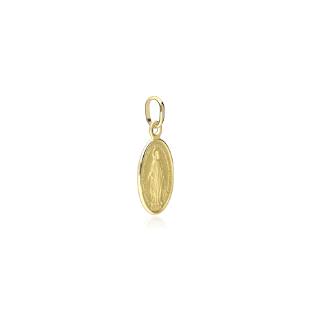 Medalla Oro 18k oval "Virgen Milagrosa": Fabricada en oro amarillo de primera ley 18k, con acabado satinado y borde pulido, en el anverso la Virgen María y el texto ¡Oh María, sin pecado concebida, ruega por nosotros que recurrimos a ti!. En el anverso la inicial m entrelazada con la cruz, que simboliza la unión entre la Virgen y Jesús y doce estrellas simbolizando los doce apóstoles. Un corazón a la izquierda y otro a la derecha, simbolizando el Sagrado Corazón de Jesús y el Inmaculado Corazón de María.