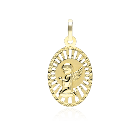 Medalla Oro 18k tallada angelito "Hervey": Medalla con figura de angelito y bordes tallados. Fabricada en oro amarillo de 18k en acabado pulido y satinado. Detalles calados que rodean a la figura central.