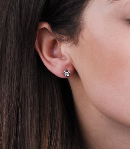 Pendientes en oro blanco de 18 quilates con diseño de chatón y un diamante en el centro.