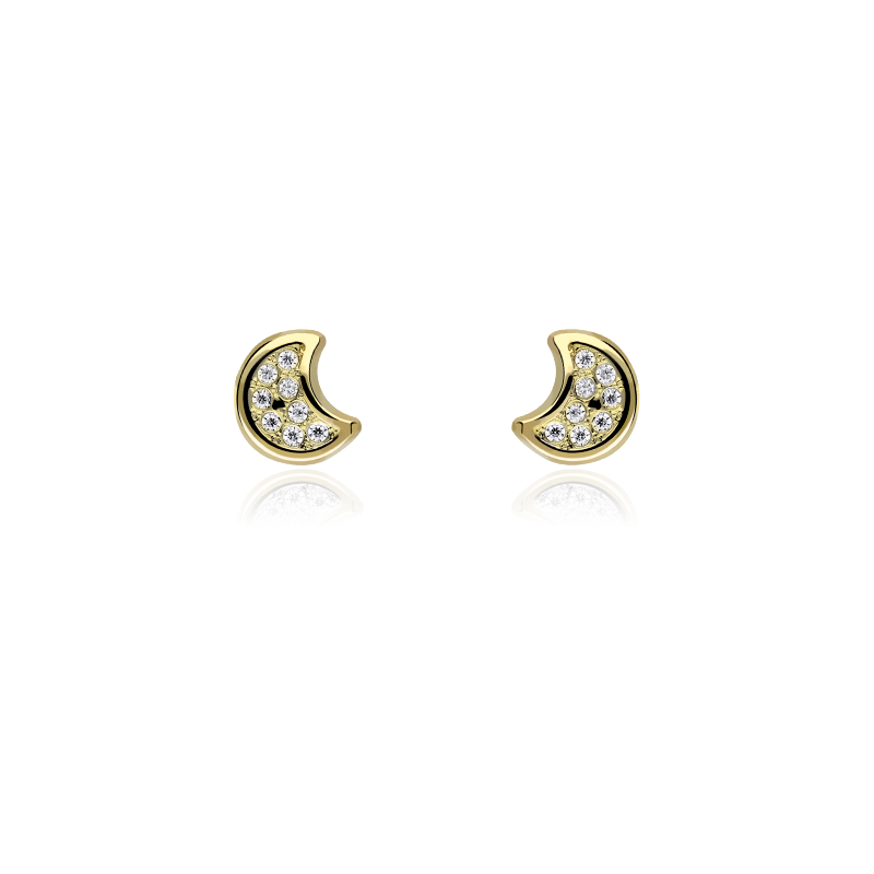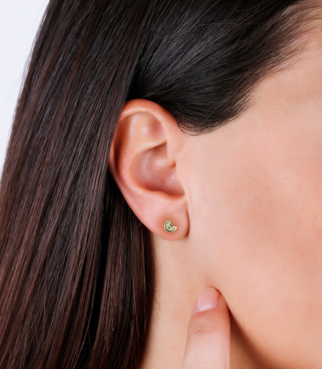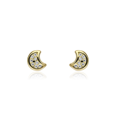 Pendientes "Mond" Oro 18k y circonitas, con forma de luna y pavé de circonitas blancas en talla brillante. Acabado pulido con un cierre de rosca, que aporta seguridad y comodidad al bebé.