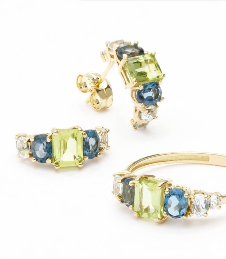 Pendientes"Topaz" Oro 18k. En oro de primera ley, pendientes originales y sutiles que llenarán de glamour cualquier outfit! Cuentan con dos peridotos centrales en color verde, seguidos de cuatro topacios "London Blue" terminando en sus extremos con ocho topacios azules. Espectacular mezcla de tonos azules y verdes.