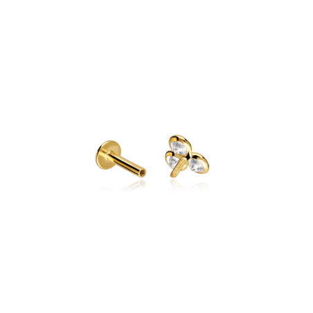 Pendiente piercing Oro 18k y circonitas "Trébol 5mm": Pendiente piercing fabricado en oro amarillo de 18k con 3 circonitas transparentes de talla brillante, en un precioso acabado brillante o pulido. Cierre de tipo rosca con acabado plano para mayor comodidad y seguridad en su puesta. Combínalo con el resto de nuestra colección de piercings.