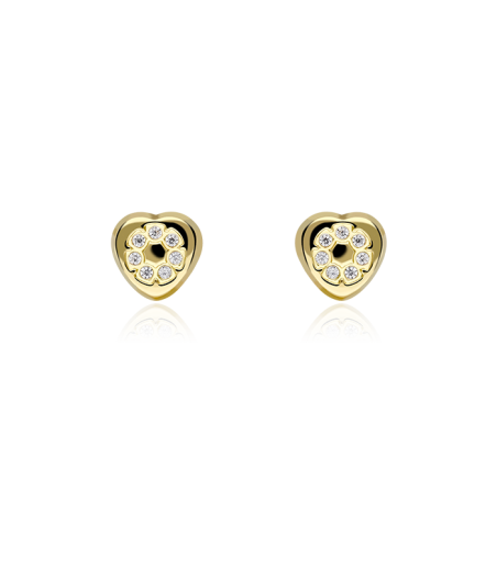 Pendientes corazón en oro de 18 quilates y con elegantes circonitas en su interior en talla princesa, acabado pulido y cierre de tuerca. Una joya ideal para esas pequeñas coquetas. Diámetro 5mm.