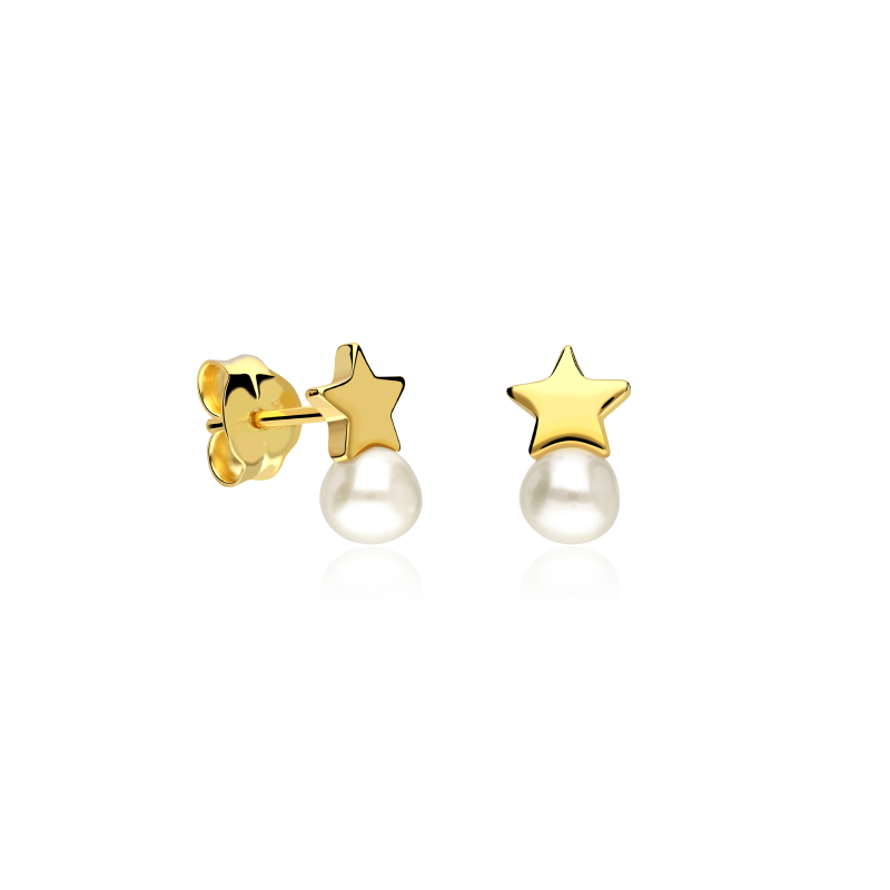 Pendientes Plata primera ley y perlas "Estrellita": Pendientes de tipo "Tú y yo" fabricados en plata de primera ley de acabado pulido con baño en Oro amarillo de 18 quilates. En forma de estrella de cinco puntas con una perla cultivada colgante, de cierre tipo presión.