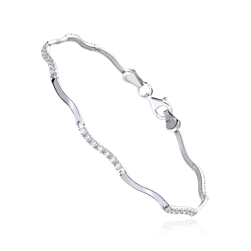 Pulsera Oro 18k blanco y circonitas "Bianca": Pulsera semirrígida con diseño ondulado, fabricada en oro blanco de 18k, decorada con circonitas transparentes en talla brillante y un impecable acabado pulido, con cierre de tipo mosquetón.