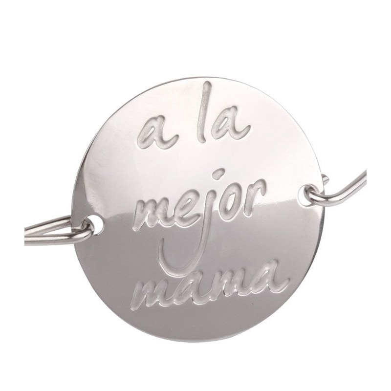 Pulsera "A la mejor Mamá" Plata de Ley: Fabricada en plata de primera ley, rígida de hilo macizo, que la hace muy resistente y flexible, con la inscripcion "a la mejor mama". Acabado pulido. Medidas: Placa 21 miímetros de diámetro; pulsera 18 centímetros de diámetro.