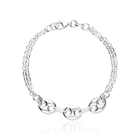 Pulsera Plata primera ley "Colombia": Pulsera fabricada en plata de primera ley de acabado pulido con doble cadena y adorno central con eslabones grandes de diseño "grano de café". Cierre de tipo mosquetón. Un diseño elegante y fácil de combinar con otras joyas de nuestra colección.