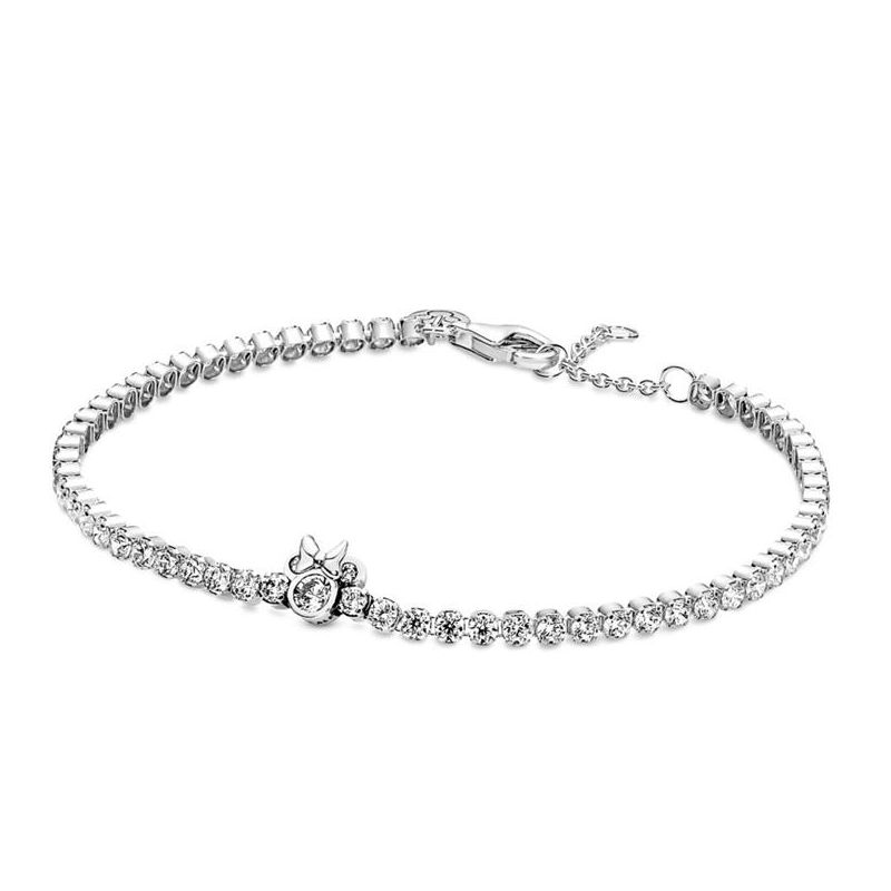 PULSERA PANDORA MINNIE MOUSE CON CIRCONITAS 590107C01. Terminada a mano y elaborada con plata de ley 925, la joya está decorada con circonitas cubicas de talla brillante colocadas a lo largo de toda la pulsera y un elemento central que representa una silueta brillante de Minnie Mouse, de Disney. Con posibilidad de regular el cierre para mayor comodidad.