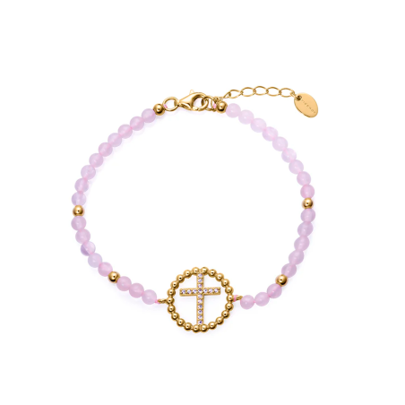 Pulsera Viceroy Plata y circonitas 13233P100-97: Elaborada en plata de primera ley con baño de oro, esta pulsera de niña es una joya que combina suavidad y elegancia. Decorada con piedras naturales en tono rosa, su diseño irradia frescura y delicadeza. La cruz central, adornada con brillantes circonitas blancas, aporta un toque simbólico y sofisticado. Ideal como regalo especial o para complementar su estilo diario, esta pieza destaca por su mezcla de materiales nobles y detalles refinados, convirtiéndola en un accesorio único y lleno de encanto.