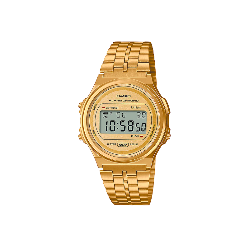 Reloj Casio Vintage Unisex Acero Dorado A171WEG-9AEF: Reloj Casio Vintage unisex fabricado en acero inoxidable con correa de malla milanesa y cierre ajustable. Es un modelo digital que cuenta con luz led para una lectura fácil de la hora, un calendario y cronómetro. Un diseño clásico fiel al estilo de la marca perfecto para el uso diario.