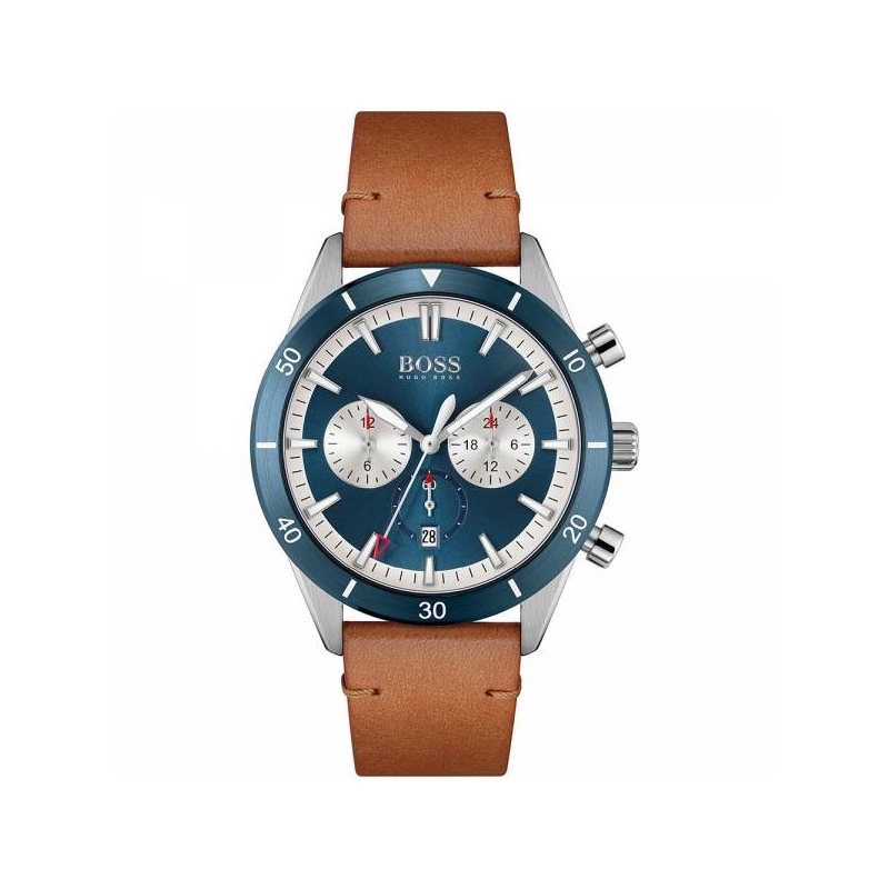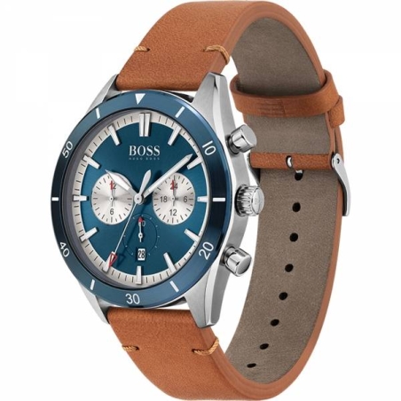 RELOJ HUGO BOSS SANTIAGO HOMBRE 1513860. Analógico para hombre con movimiento de cuarzo, correa de piel y resistencia al agua de 50 metros. Con un diseño moderno y a su vez elegante con la correa de piel marrón y esfera y caja color azul.