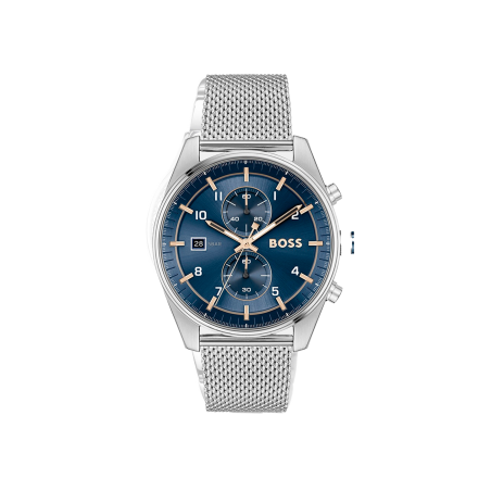 Reloj Hugo Boss Hombre Skytraveller malla milanesa 1514149 : Reloj Hugo Boss con caja de acero inoxidable en color plateado. Esfera en color azul con efecto rayo de sol y dos subesferas. Brazalete en acero inoxidable de malla milanesa