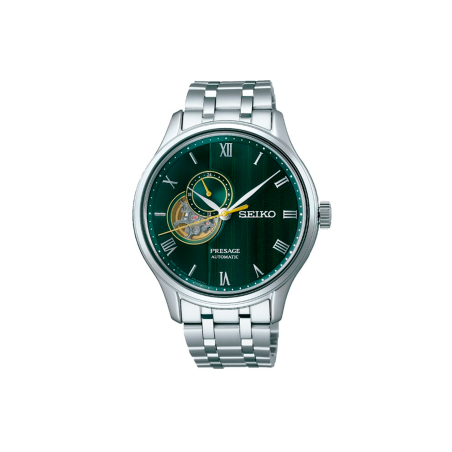 Reloj Seiko Hombre Presage Japanese Garden Verde SSA463J1: Reloj Seiko para hombre de la colección Presage Cocktail Time Japanese Zen Garden en acero inoxidable y esfera en color verde helecho. La esfera se compone de una subesfera y una ventana esqueleto a las 9h, tres agujas y marcadores en números romanos. Un diseño original y elegante perfecto para cualquier ocasión.