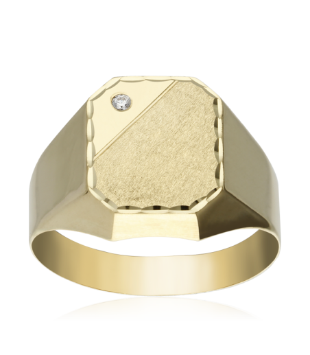 SELLO "TAHLA" ORO 18K: Fabricado en oro amarillo de primera ley, 18 quilates, frente tallado a diamante, superficie grabable satinada y banda en acabado brillo en la que engastamos una circonita cúbica transparente talla brillante. Hombros lisos acabado pulido.