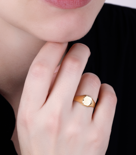 SELLO "STEFFI" ORO 18K: Fabricado en oro amarillo de primera ley, con frente satinado y filo tallado. Hombros lisos de acabado pulido. Tamaño cadete ideal para niño o niña de comunión. Acabado pulido, tallado y mate.