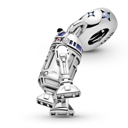 Charm colgante R2-D2 Star Wars 799248C01 en plata de primera ley, adornado con un anillo de unión de circonitas azules y esmalte azul rojo y negro.