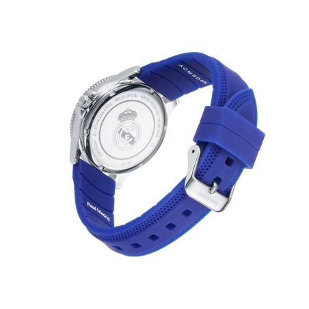 Reloj Viceroy Real Madrid Acero y Silicona 41118-05: Reloj Viceroy Real Madrid, tres agujas, caja de acero con bisel azul y correa de silicona azul, esfera blanca.