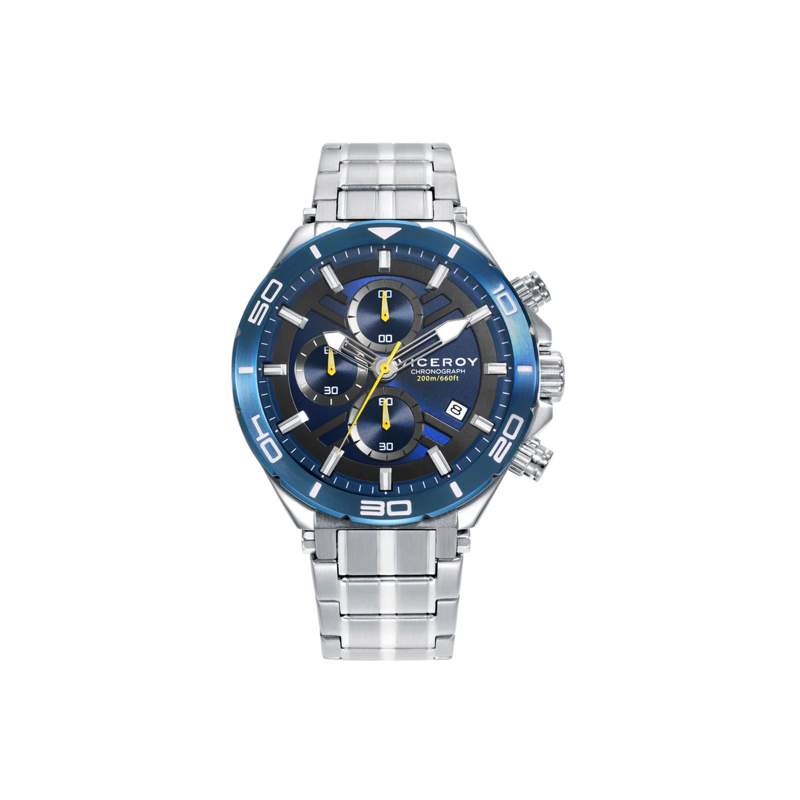 Reloj Viceroy Cronógrafo hombre 46841-37. Este reloj de hombre cronógrafo combina un diseño robusto y elegante con funcionalidad avanzada. La caja de acero, junto con el bisel azul no rotatorio, aporta durabilidad y un estilo sofisticado. El brazalete de acero complementa su construcción sólida, mientras que la esfera azul, con índices y agujas de horas en color plata, ofrece un contraste sutil y refinado. Las agujas de segundos y contadoras en color amarillo añaden un toque dinámico y moderno. El cristal mineral asegura una protección resistente, haciendo de este reloj una opción perfecta para el hombre que valora tanto el estilo como la funcionalidad.